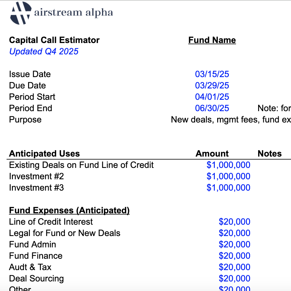 Our Basic Capital Call Estimator simplifies the process of estimating capital calls to ensure accurate financial planning and efficient fund management.